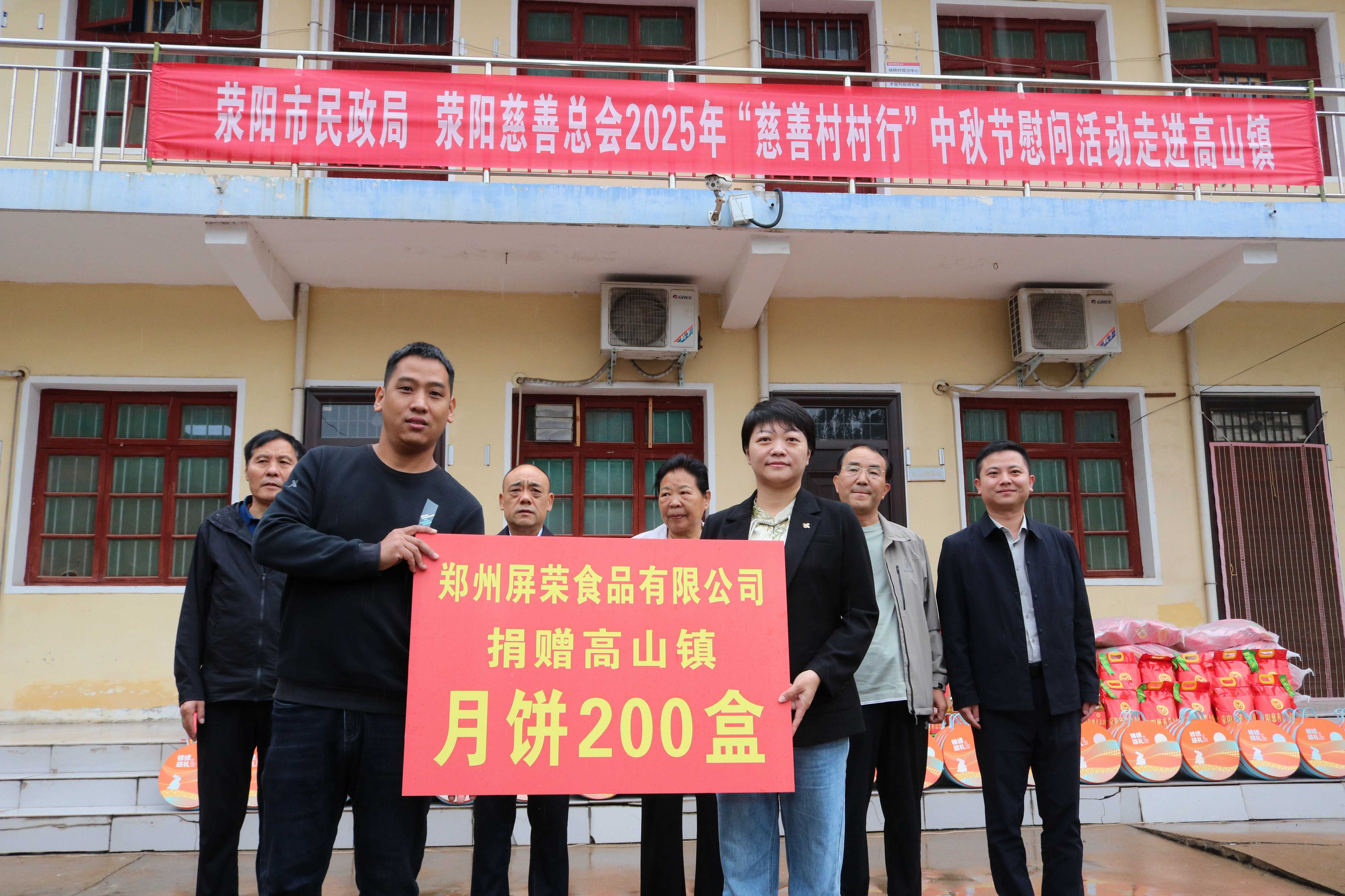 金风送爽丹桂香,硕果满枝秋菊黄。9月26日上午,荥阳市民政局、荥阳慈善总会联合郑州屏荣食品有限公司在高山镇杨桥村开展2025年“慈善村村行”中秋节慰问活动,帮助高山镇100户困难群众度过一个温暖有爱的中秋佳节。